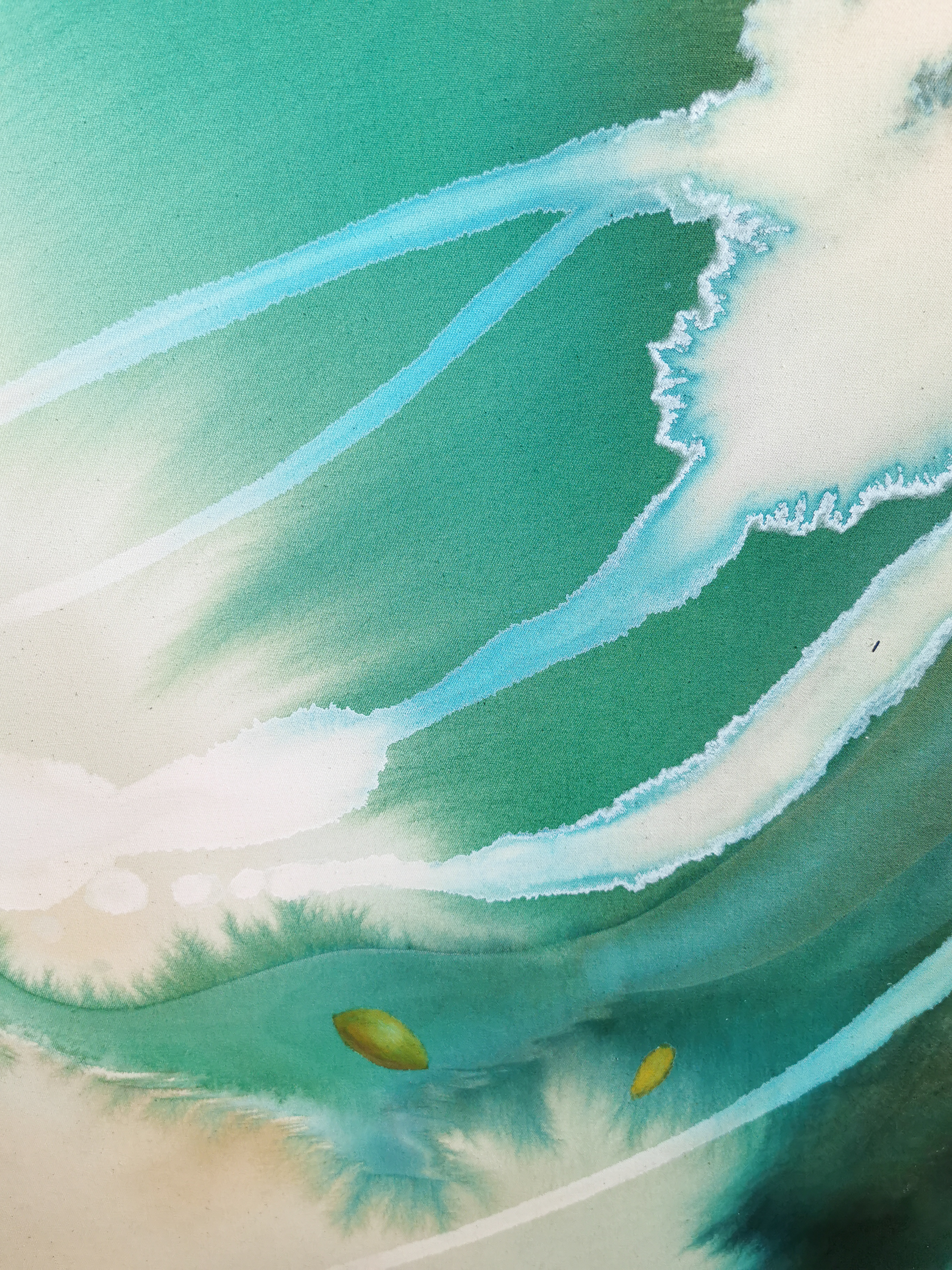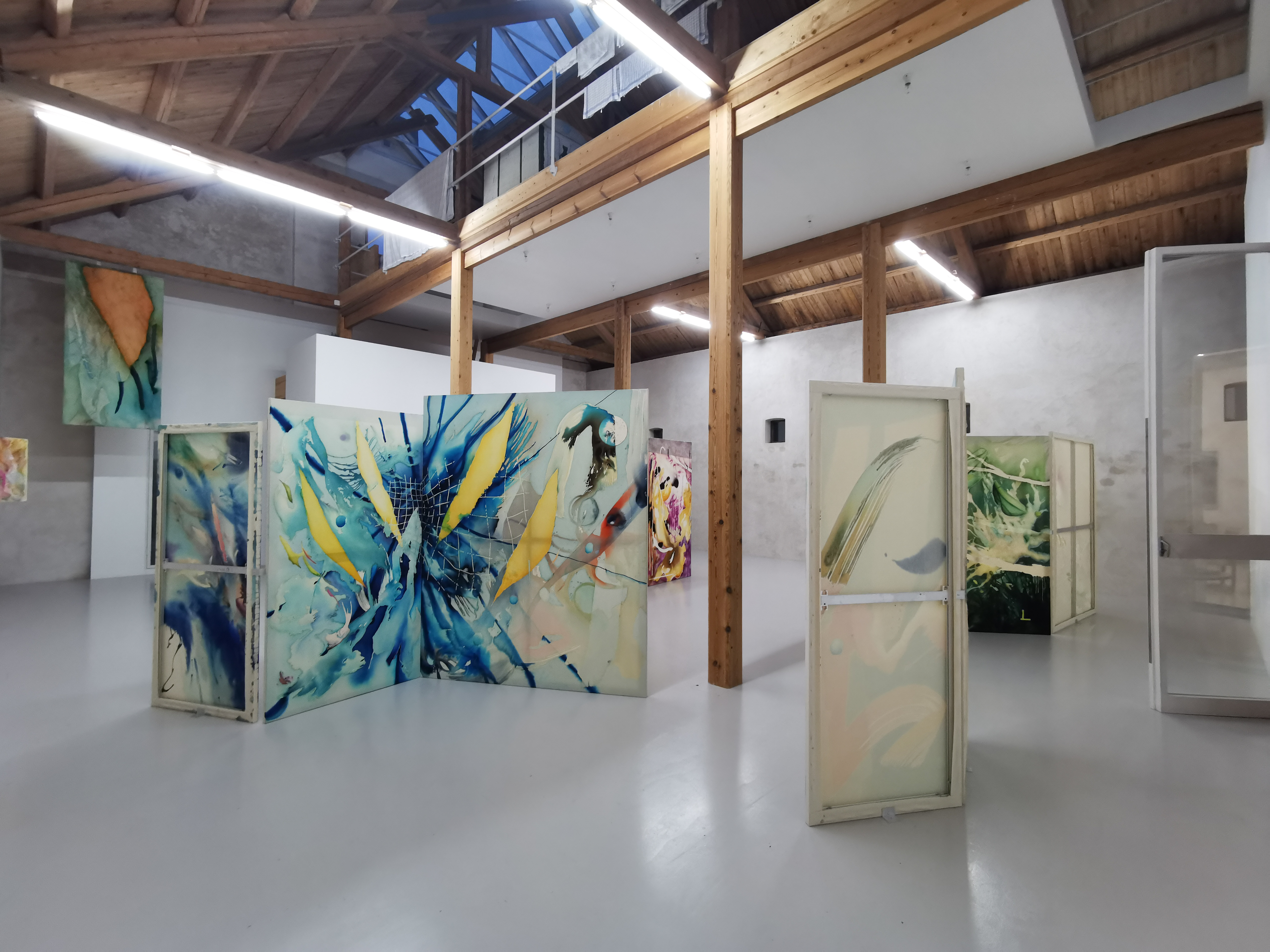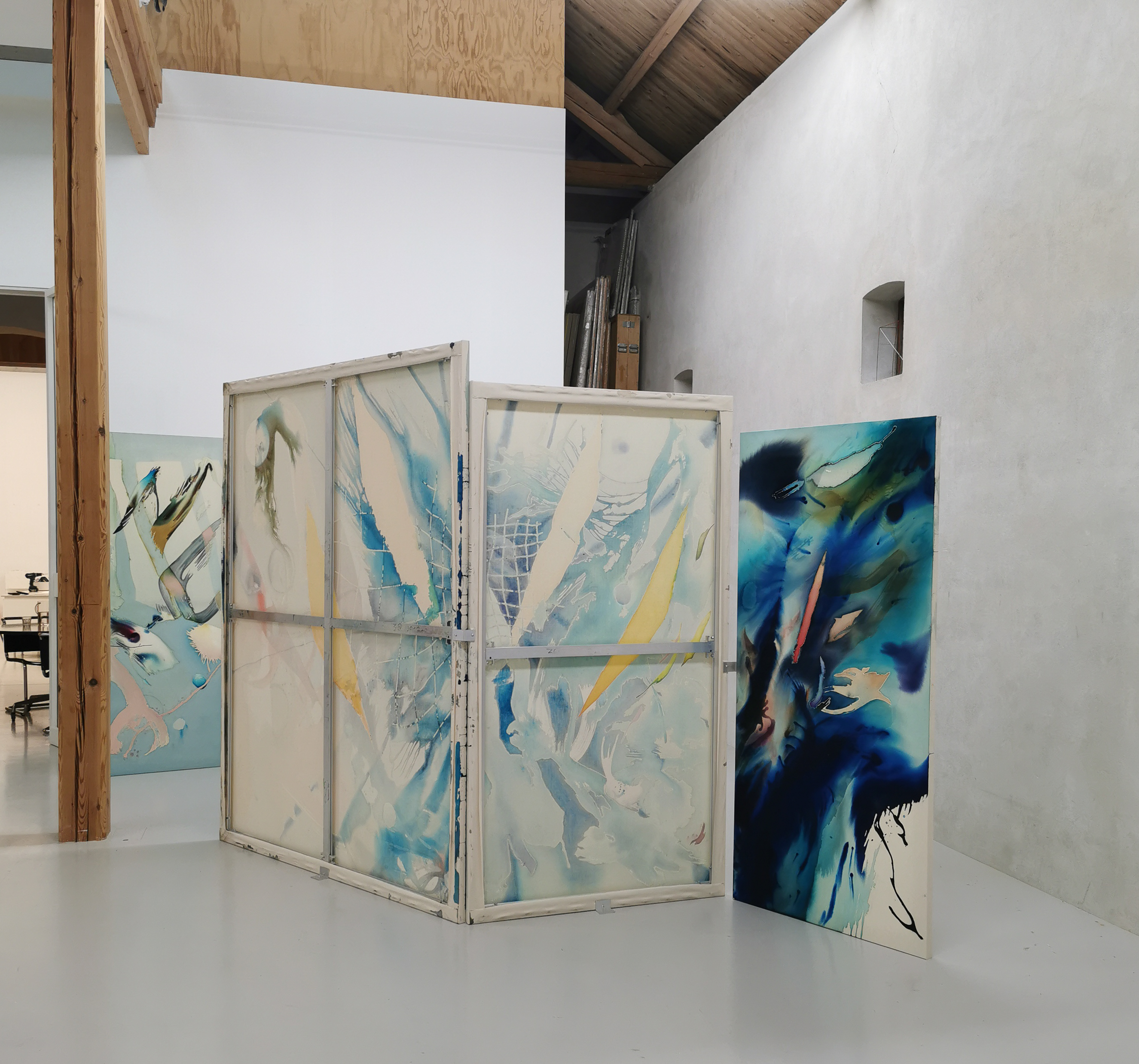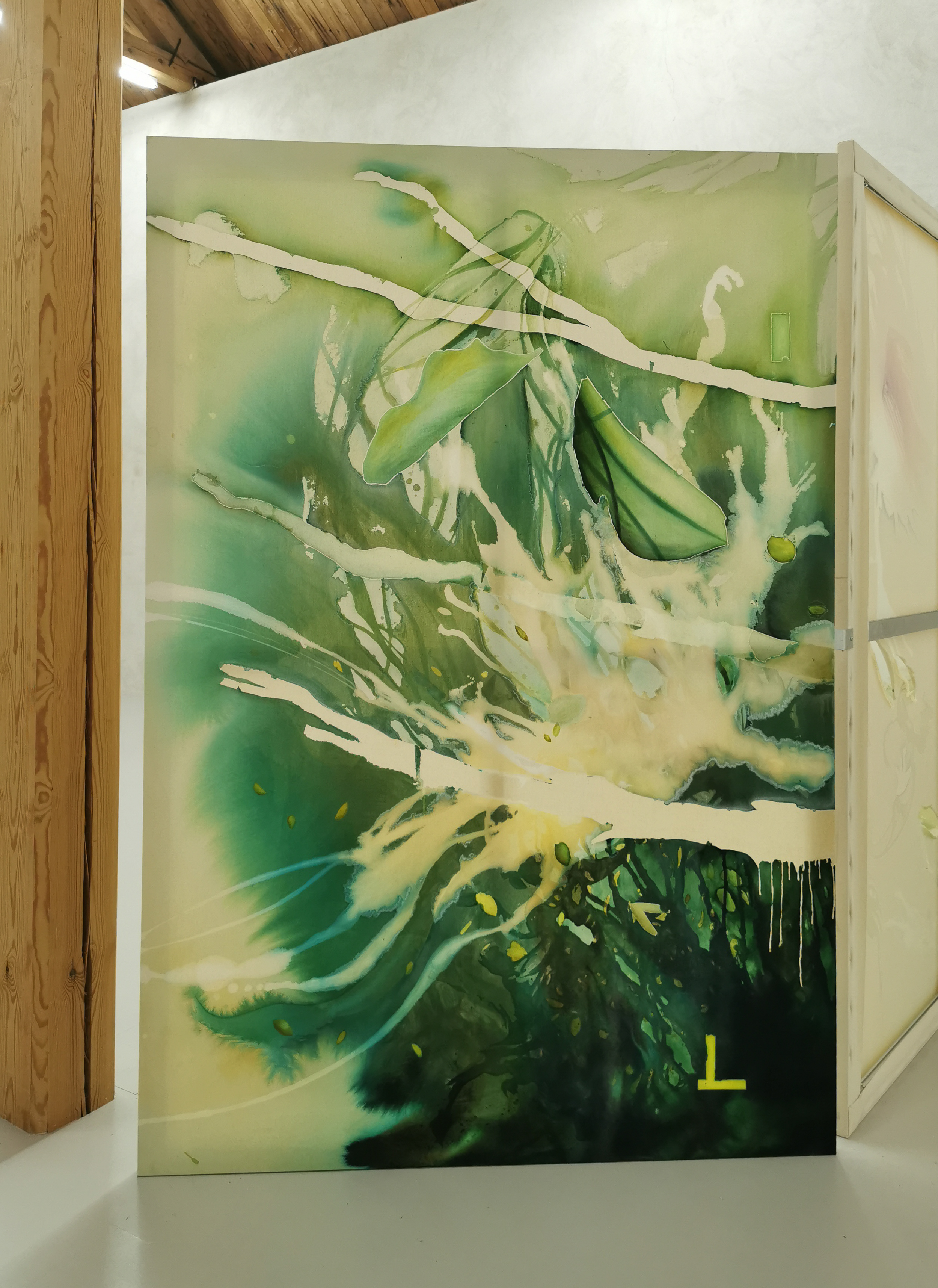 her paintings are transposed into screens that stand on the floor in groups around the columns. Each group has a dominant colour, blue, green, yellow. Her thin cotton canvases differ in height and format and lean on each other for support, becoming tableau walls. Jorunn Hancke Øgstad portrays an interaction of painting and staining processes whose imagery spills from one canvas into another. The complex assemblies are informed by digital flatness, with scales of transparency and speed that are both literal and phenomenal. Swirls, vortexes, splashes, dilutions, overlays of bleeding shapes, suggestions of dubious spontaneity, explosions of dissonances on the screen, through the screen, in the space, flattened explosions in Krutthuset.